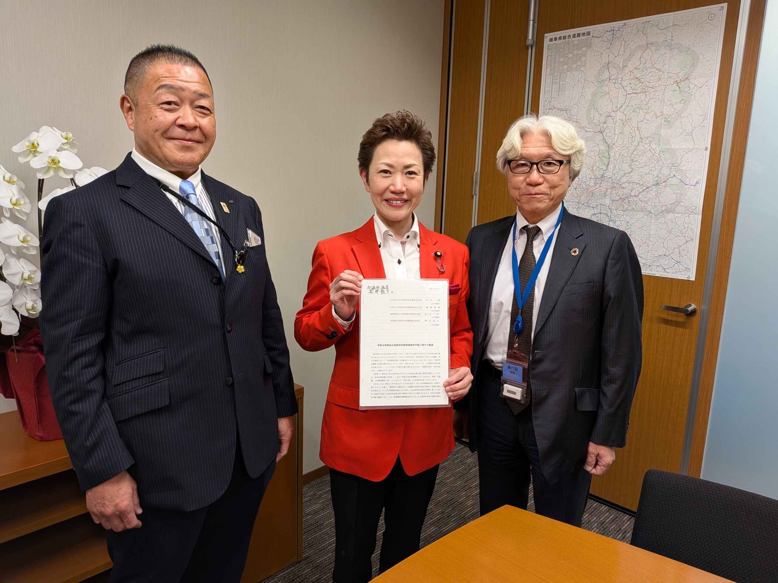 (写真は若井あつこ参議院議員、横山浩之岐阜県私立高等学校保護者連合会会長、佐々木淳岐阜県私立中学高等学校協会会長)